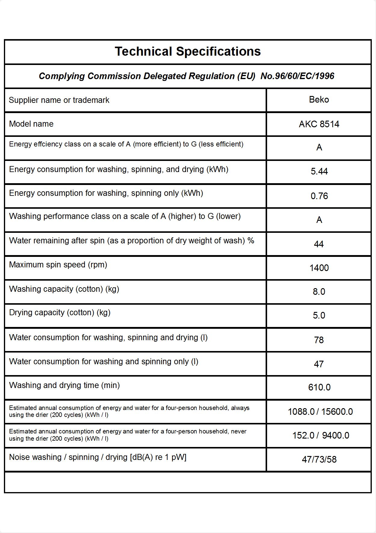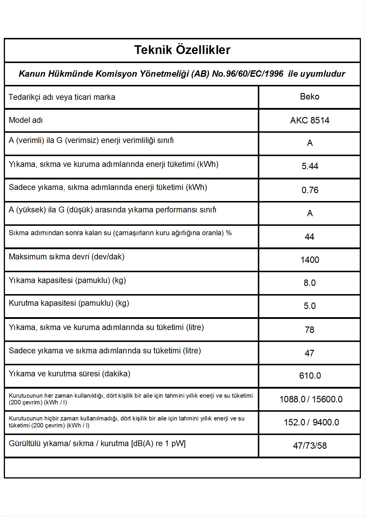 Ses Seviyesi-Yıkama/Sıkma/Kurutma (dBA)