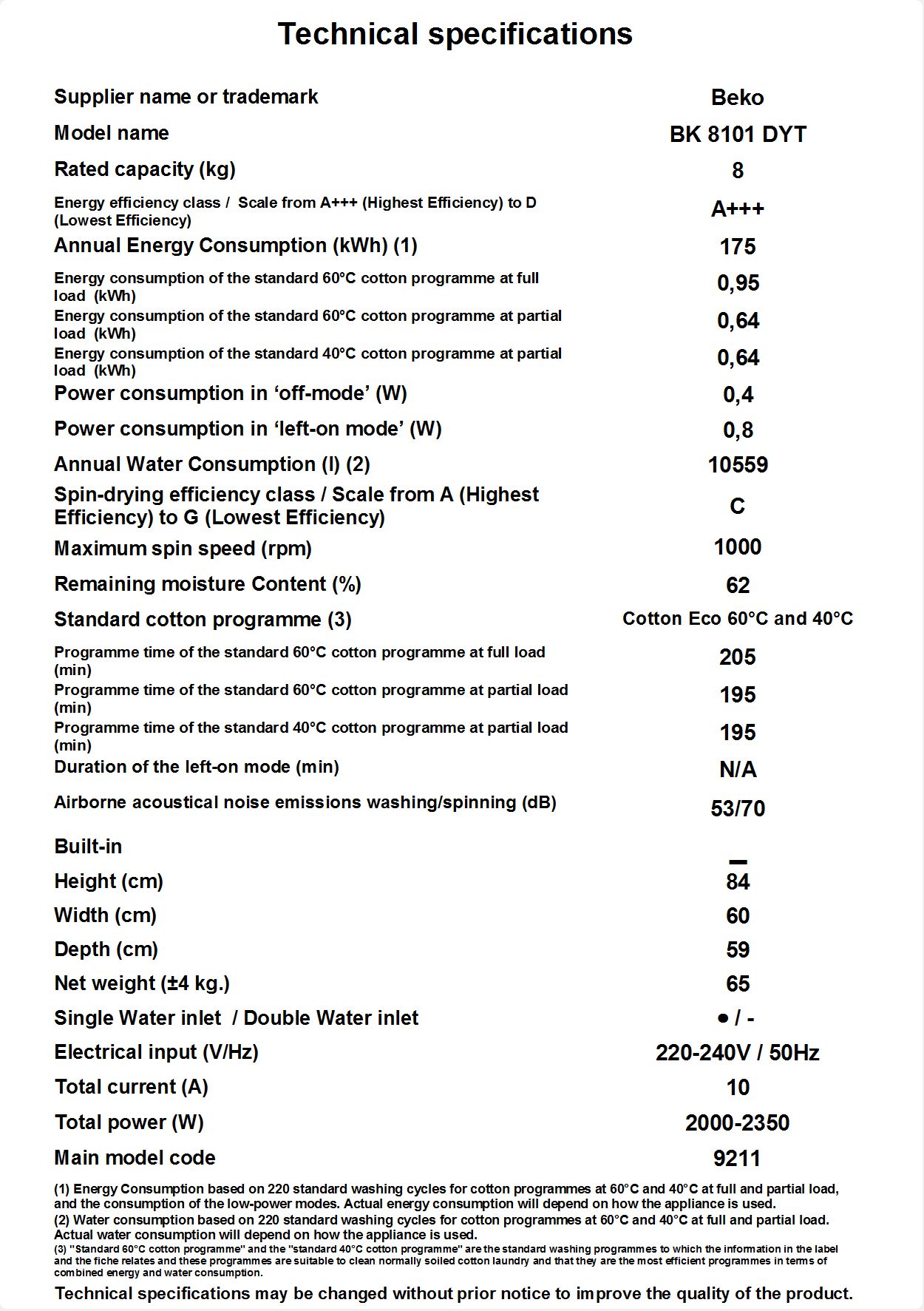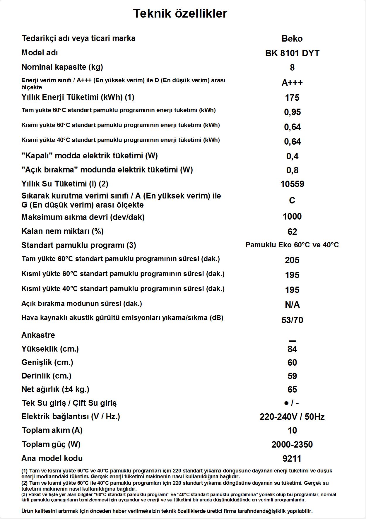 • BK 8101 DYT Çamaşır Makinesi