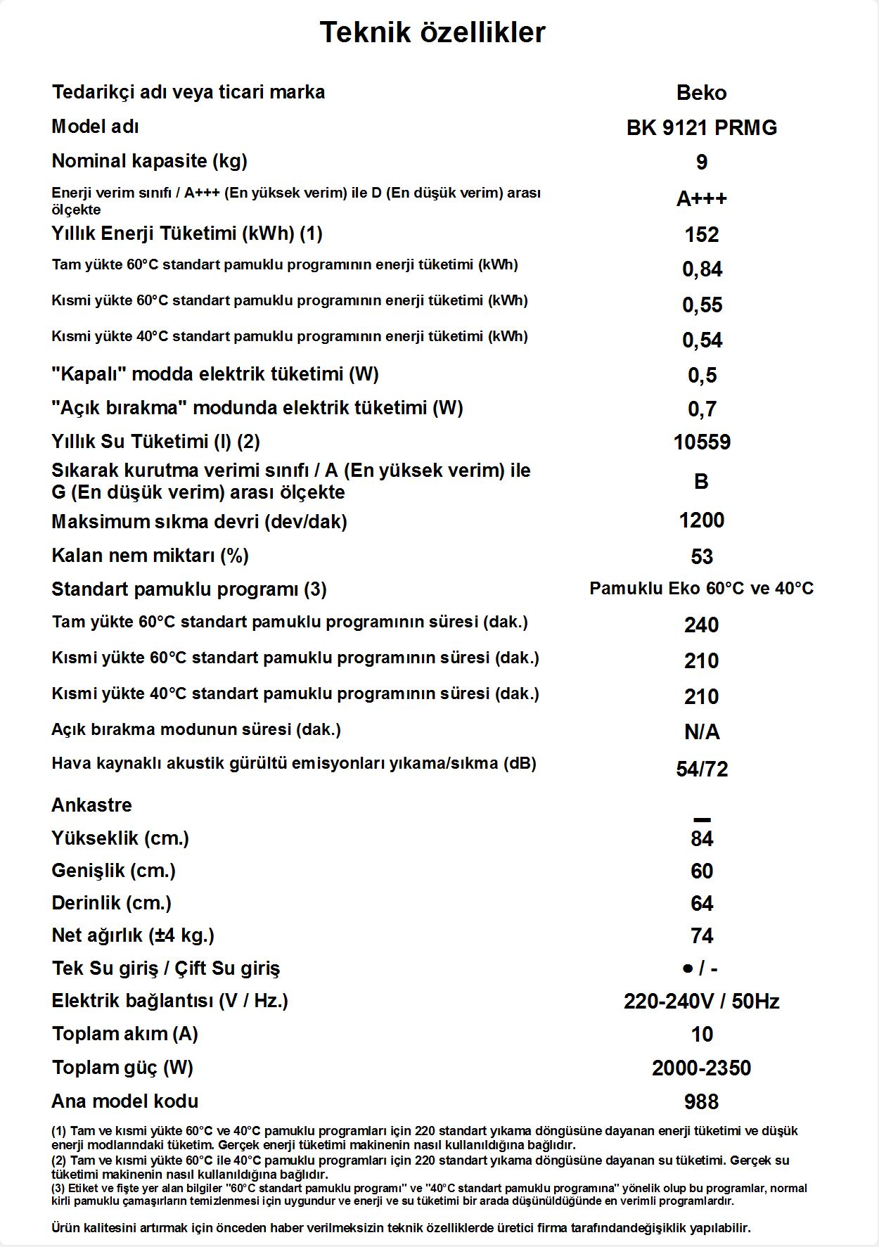 Yıllık Elektrik Tüketimi (kWh) (220 Yıkama)
