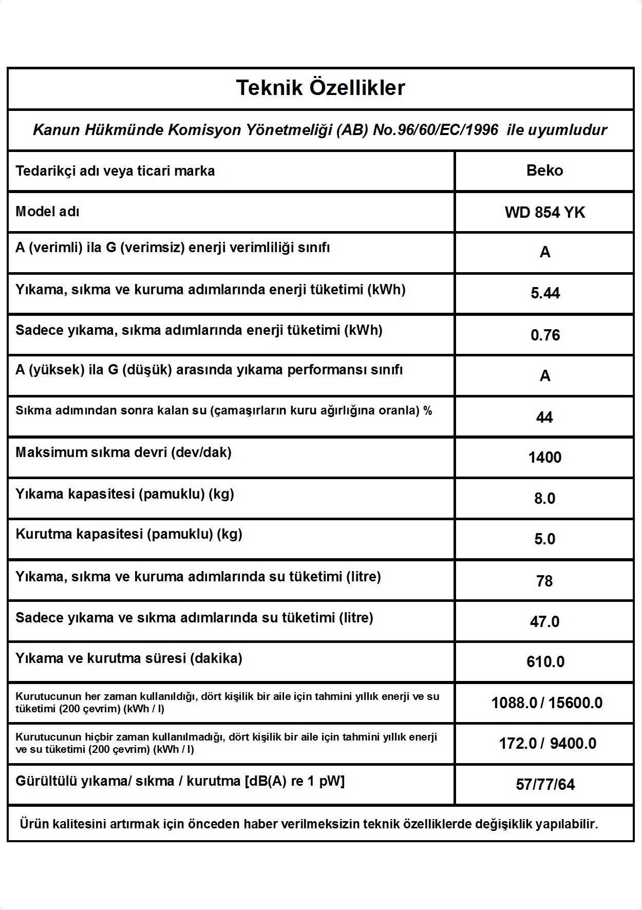 Ses Seviyesi-Yıkama/Sıkma/Kurutma (dBA)