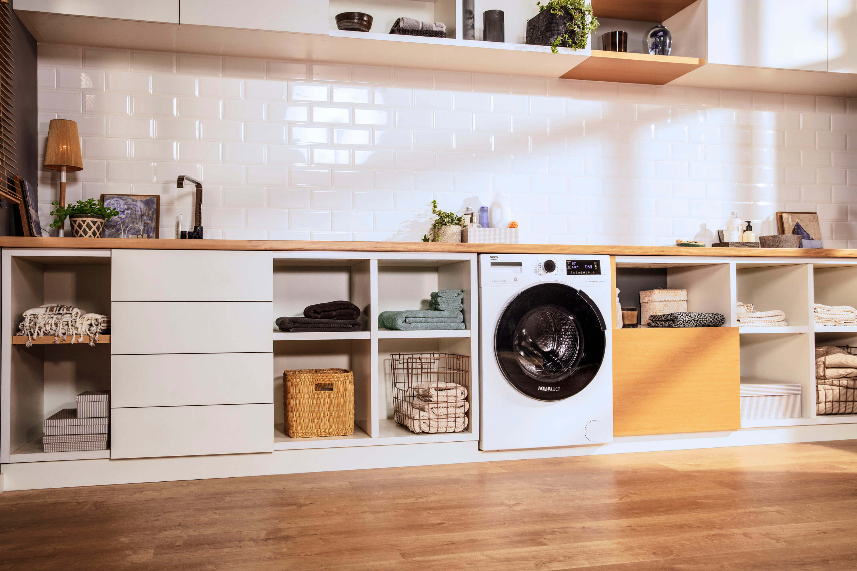 Ankastre çamaşır makineleri, banyo ya da mutfakta oluşturulan özel alana yerleştirilerek kullanılıyor. Çamaşır makinesinin önüne monte edilen ahşap ise evinizin mobilyalarıyla bütünlük sağlıyor. Buna ek olarak ankastre çamaşır makinelerinin mobilyalara gömülü bir şekilde kullanılması, alandan da tasarruf etmenizi sağlıyor.